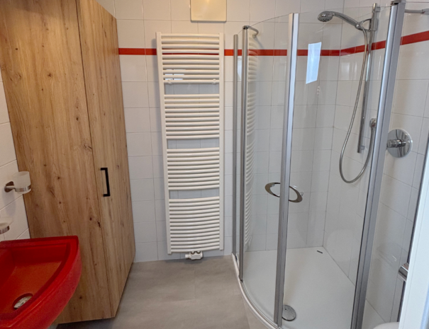 Das Badezimmer ist mit Dusche, Waschbecken und WC ausgestattet. Handtücher, Duschtücher und Bademantel für den Innenbereich sowie separate Handtücher für Pool und Liegewiese stehen bereit und sorgen für einen komfortablen Aufenthalt.