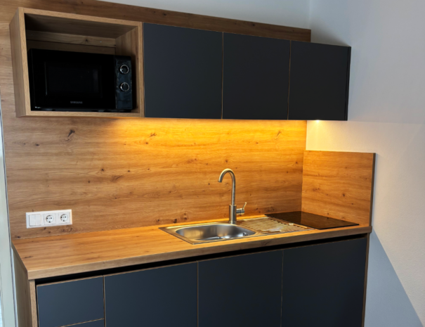 Die moderne Küche ist voll ausgestattet: Kochfeld, Spülmaschine, Mikrowelle, Kühlschrank, Geschirr und Kochutensilien stehen bereit. WLAN, Fernseher, Kaffeemaschine und eine hochwertige Grundausstattung sorgen dafür, dass Sie im Urlaub alles bequem zur Hand haben – vom Kochen über gemeinsame Mahlzeiten bis zu entspannten Stunden im Apartment.